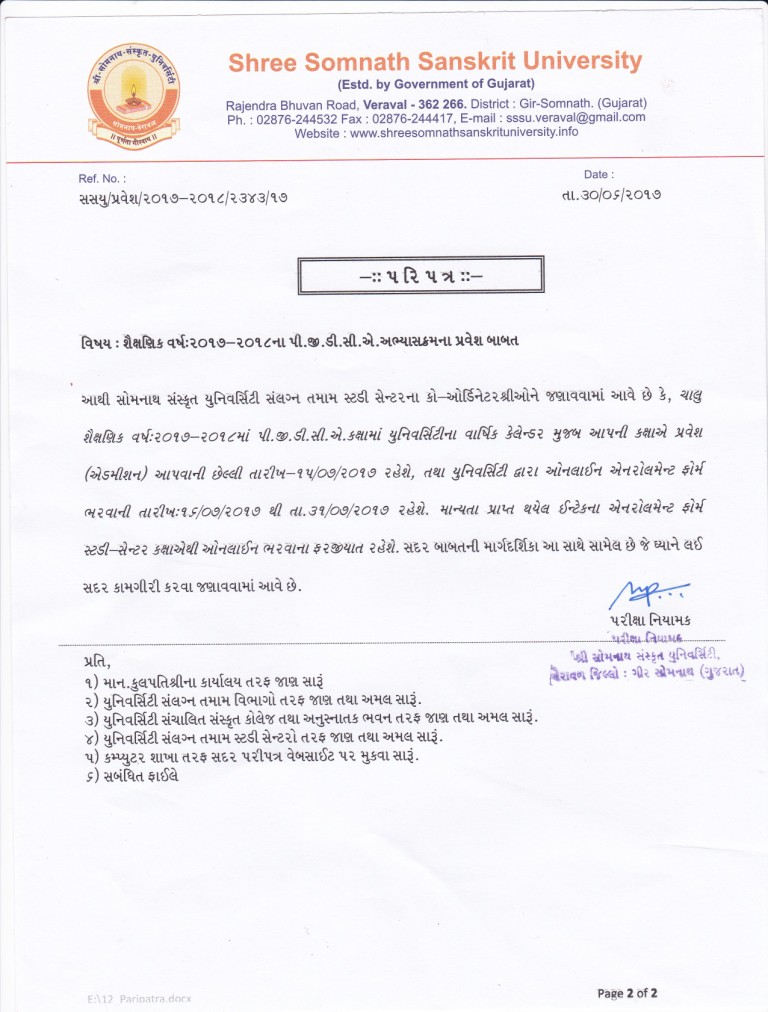 -> શૈક્ષણિક વર્ષ:૨૦૧૭-૨૦૧૮ના અભ્યાસક્રમોના પ્રવેશ અંગેનો પરીપત્ર Download